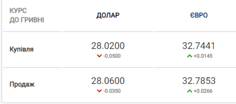євро: купівля – 32.68, продаж – 32.80