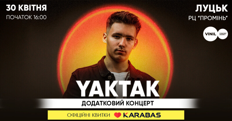 “Пісні YAKTAK влучно поєднуються з життєвими переживаннями кожного з нас! Адже він співає мовою душі, тож у нього є що Вам сказати. Чудовою нагодою стане сольний концерт 30 квітня. Побачимось в РЦ «Промінь» о 16:00 та 18:00!”, – запрошують на концерт організатори VINIL Concert agency.