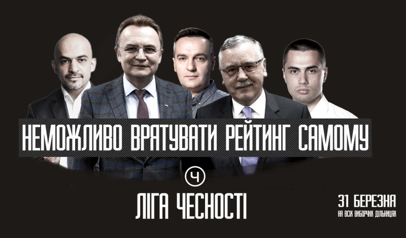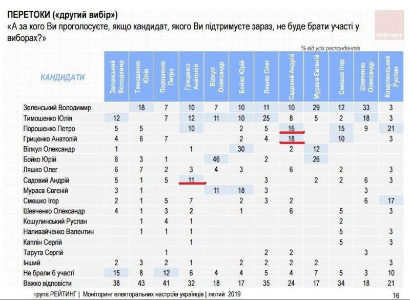 Він наводить результати соцопитування, проведеного групою «Рейтинг» у лютому 2019-го. Так, відповідно до нього 18% виборців Садового у разі зняття їх кандидата з виборів були готові підтримати Гриценка, 16% прихильників міського голови Львова обрали б Порошенка, а 10% респондентів лідера «Самопомочі» готові голосувати за Зеленського. Частина виборців Гриценка теж досить позитивно ставиться до Садового.