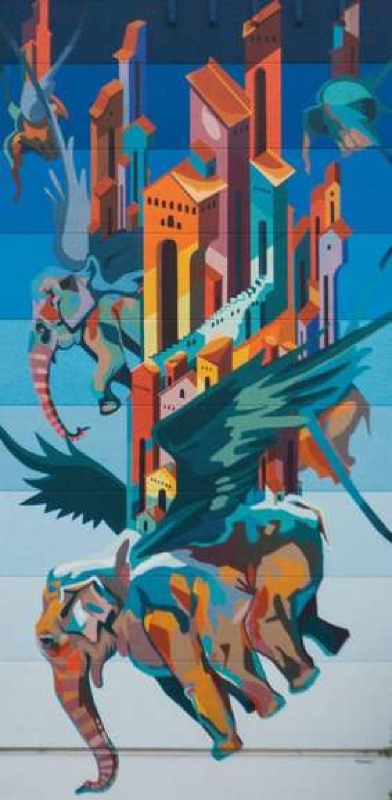 Мурал «Літаюче місто» використовує технологію доповненої реальності: якщо навести на нього камеру смартфону або планшету, використовуючи спеціальний додаток, то зображені на стіні слони починають летітити.