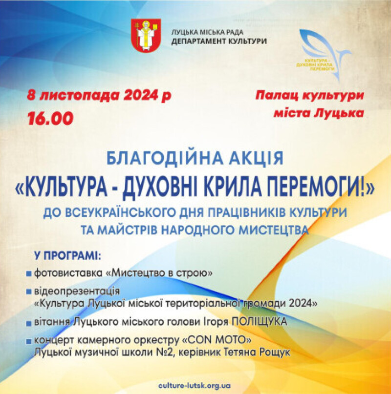 У п’ятницю, 8 листопада о 16:00 в Палаці культури міста Луцька відбудеться благодійна акція «Культура – духовні крила Перемоги» з нагоди Всеукраїнського дня працівників культури та майстрів народного мистецтва.