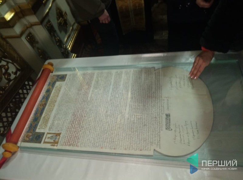 Томос поклали на стіл під скло і дозволили людям підходити. Прихожан просять не затримуватися біля документу. Втім, дозволяють фотографувати.
