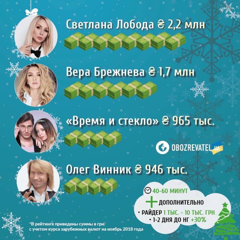 Напередодні новорічних свят гонорар артистів за 50-хвилинний виступ на приватному заході становить 30 тис. євро, – пише Обозреватель.