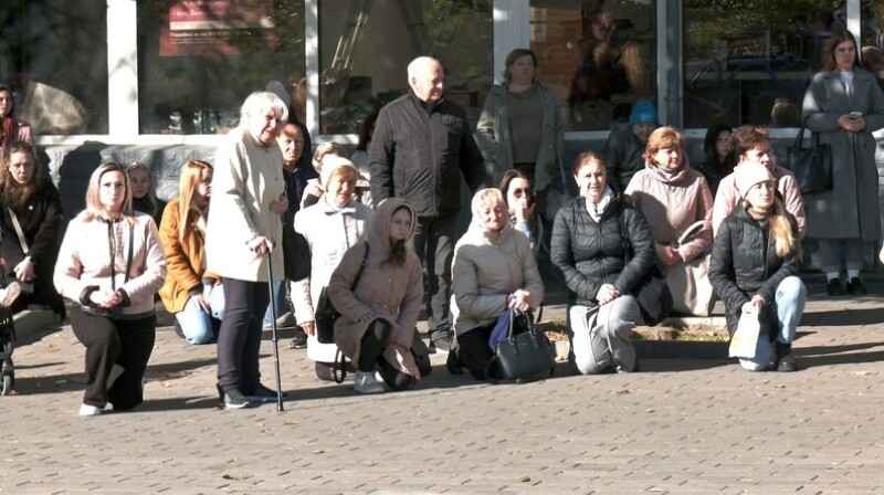 Після завершення чину похорону домовину з бійцем пронесли Театральним майданом. Люди зустріли воїна на колінах.