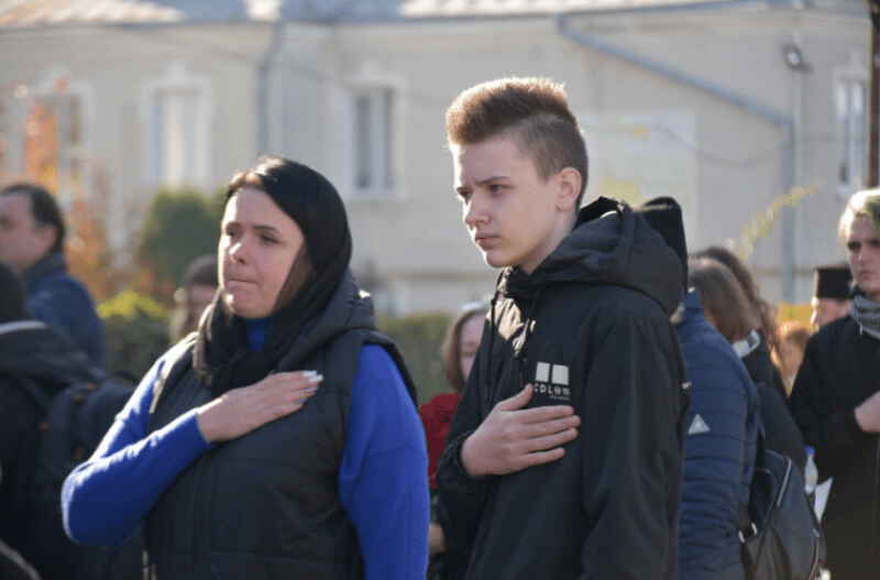 Біля фотостенда пам’яті загиблих Героїв траурна процесія зупинилася і виконала Державний Гімн України.