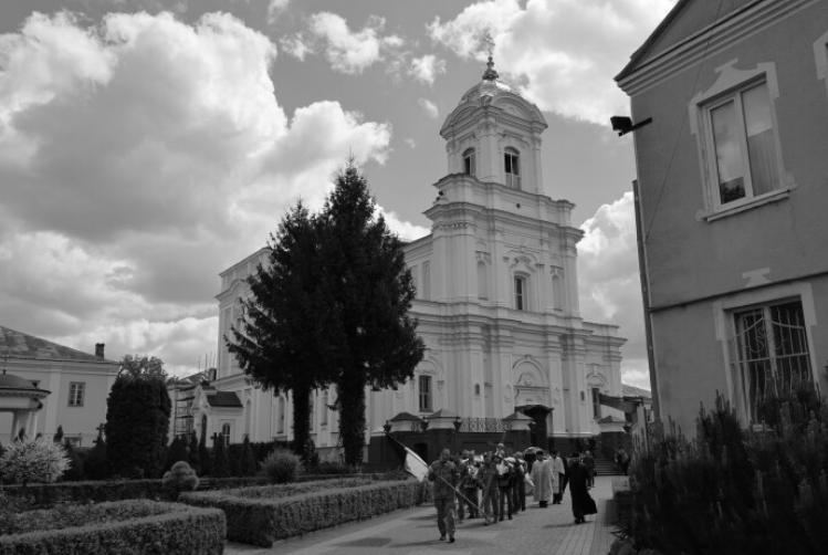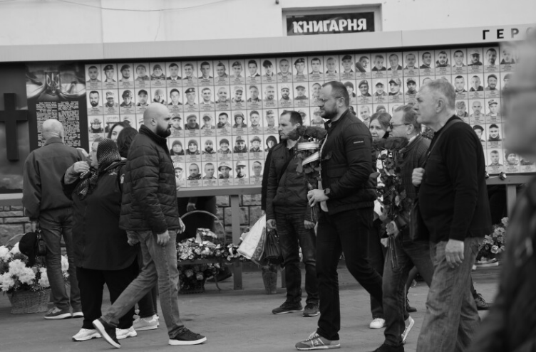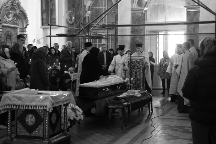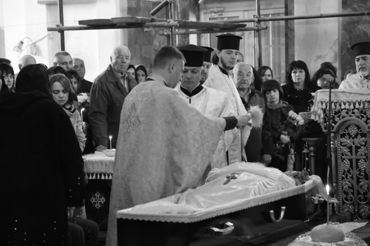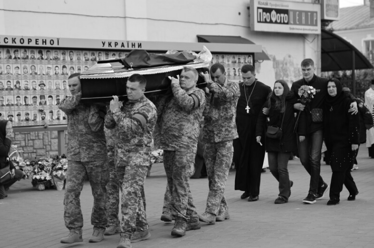 Після завершення богослужіння труну з тілом покійного захисника пронесли Театральним майданом. Біля пам’ятного фотостенда загиблим Героям траурна процесія зупинилася і виконала Державний Гімн.