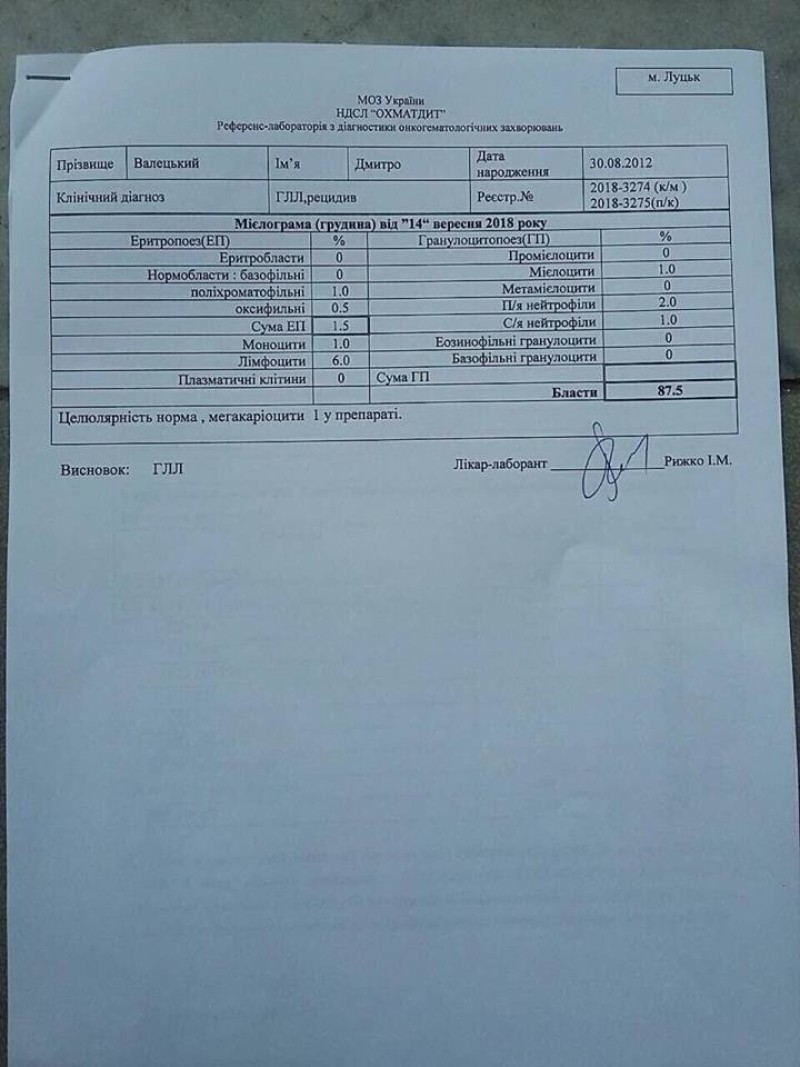 Хвороба дуже сильно прогресує, аналізи з кожним днем гірші. Потрібно термінова допомога. Дмитро знаходиться у Луцькій обласній лікарні, онкогематологічному відділені. Терміново потрібно лікування закордоном. Сума для родин непідйомна - 18 тис. доларів.