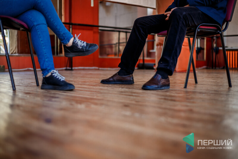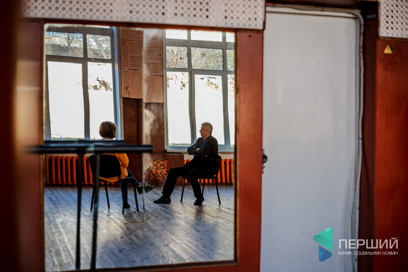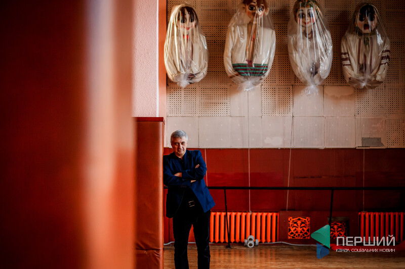 Зверху просто над нашими головами висять великі ляльки у торбах (то концертний реквізит). У дзеркалах відбиваються ніжки наших стільців, мої кросівки і його туфлі. Потертий паркет. Тут вони навіть кола нормального зробити не можуть. Кожна прем’єра хору, то заодно і генеральна репетиція, бо у цього колективу нема приміщення, де можна було б щось відрепетирувати наповну. Тому він бачить результат тільки разом із глядачами.