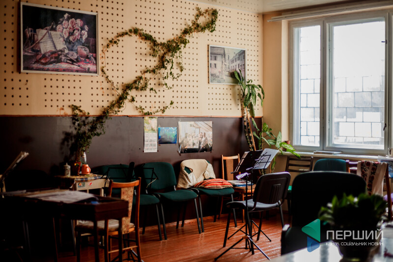 Олександр Стадник показує хороми Волинського народного хору. За балетною залою – роздягальні. За ними - оркестровий клас. Тут – багато світлин на стінах, музичних інструментів. Тут – чайник, кружки, стільці і ноти…