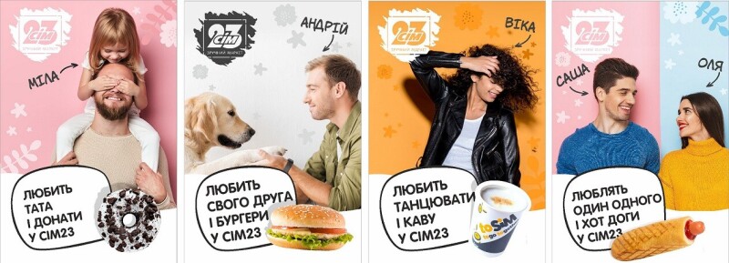 Маркети Сім23 оформлені у весняній стилістиці. Тут можна легко впізнати себе, адже всі ми любимо рідних, друзів, домашніх улюбленців, каву, донати і хот-доги.
