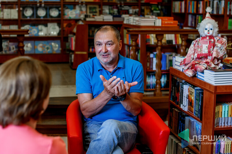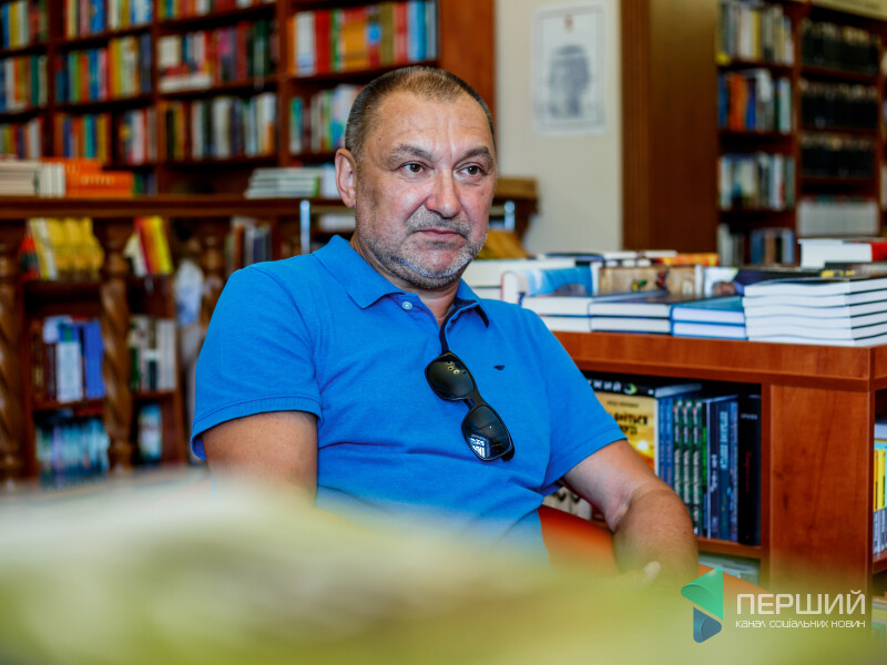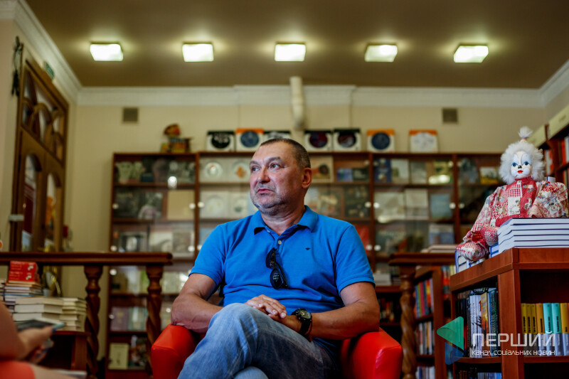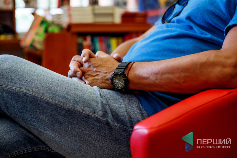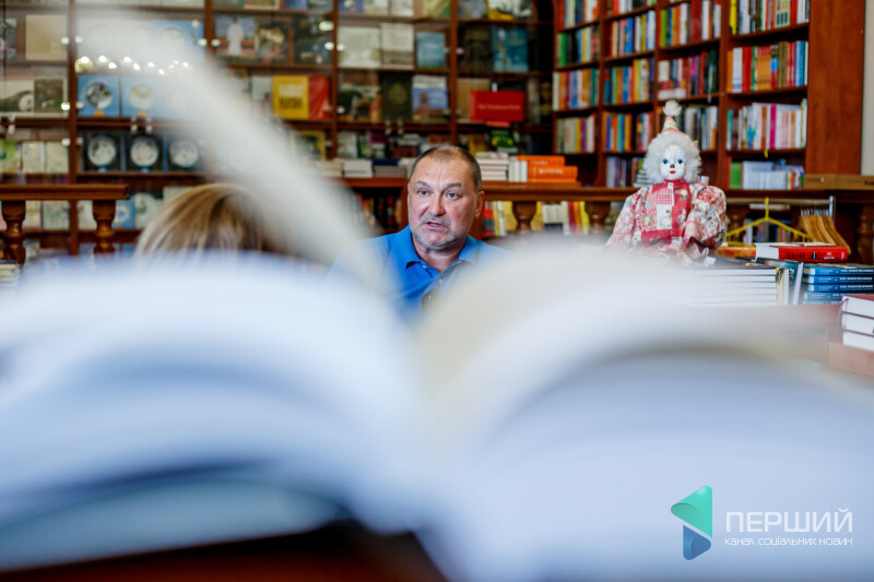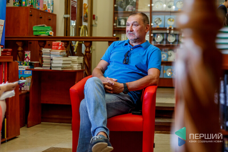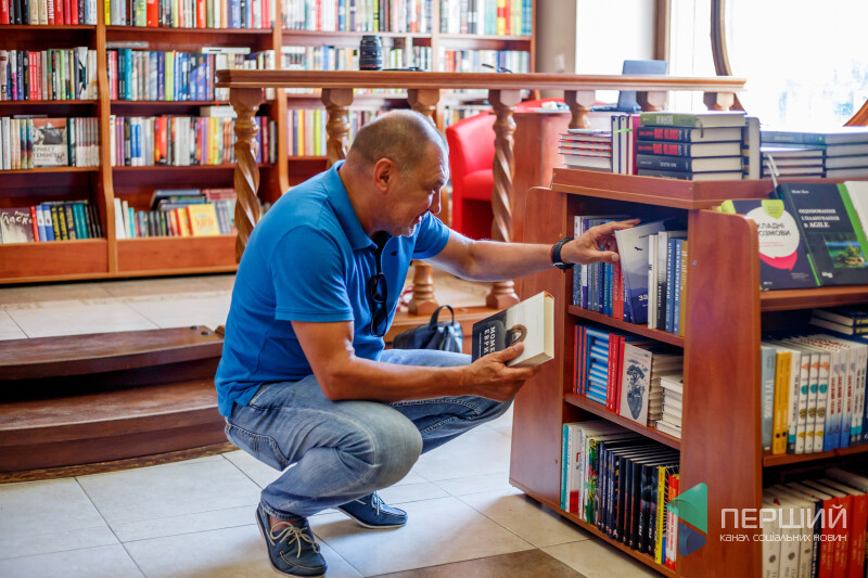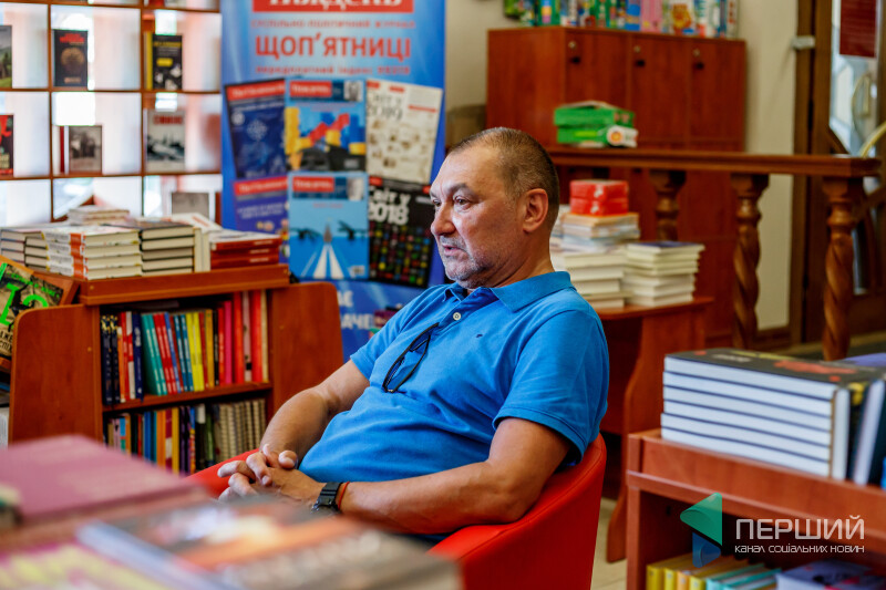 (Тут, у луцькій «Книгарні Є», Олег Іванюк уперше. Тому серед книжок і серед людей - цього дня у крамниці було дуже людно - почувається, очевидно, як в незнайомому ресторані. Приглядається. Одразу помічає деталі. Поки ми розмовляємо, встигає читати палітурки і яскраві заголовки книжок, які його оточують, – авт.)