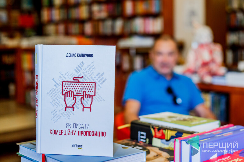 … «І от ми зараз тут подивимося (оглядається) і побачимо, що є багато книг про бізнес. Ну от, стоїть книжка «Як писати комерційну пропозицію» (автор – український копірайтер Денис Каплунов), але як правило, література така – це частина великого бізнесу. Ця книжка коштує, думаю, гривень 300 (бере в руки і дивиться ціну). Ну, от: 258, я не помилився.