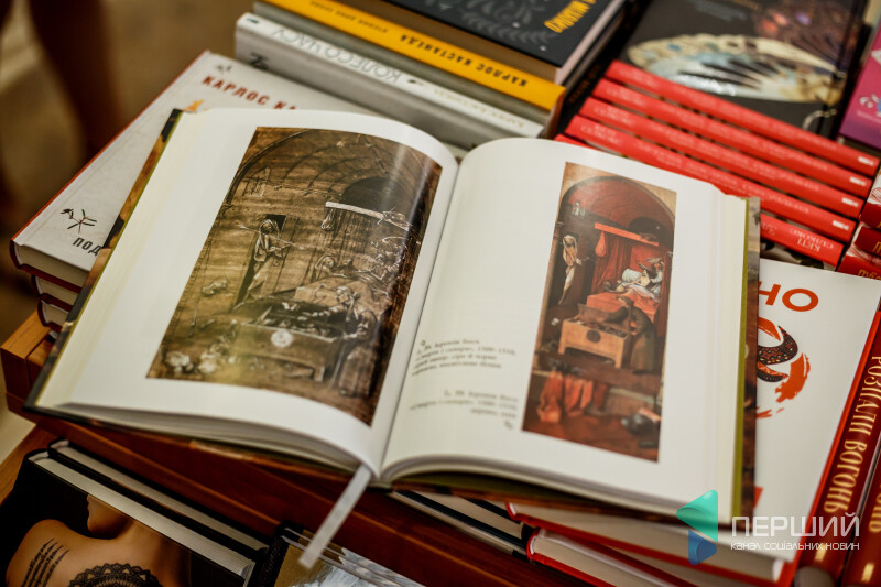… «Перше, що я хочу вам сказати, що мене дуже радує те, що в нас з’являється все більше гарних книг українською мовою. Наприклад, ось той же Ієронім Босх. Не думаю, що це у великому попиті, правда. У великому попиті воно у вас? (до продавчині книгарні, чує що – так) Ого. Здивований. Мені дуже приємно, що такими книгами цікавляться. Це потужна річ. Босха я собі вже взяв.