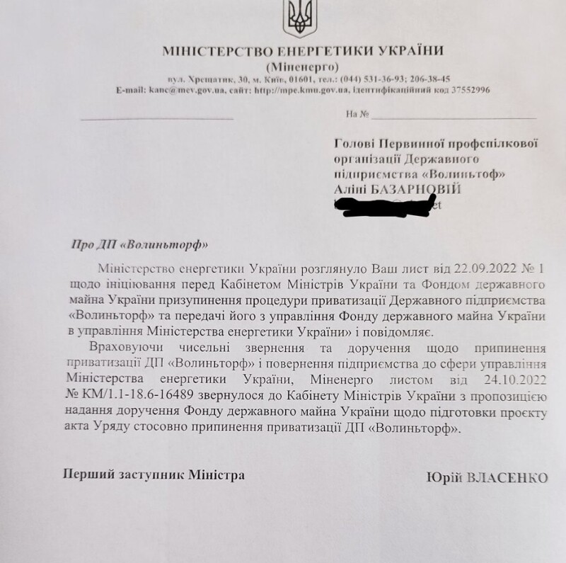 Міністерство Енергетики України ініціює припинення процедури приватизації державного підприємства "Волиньторф".