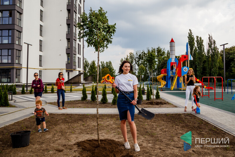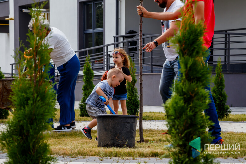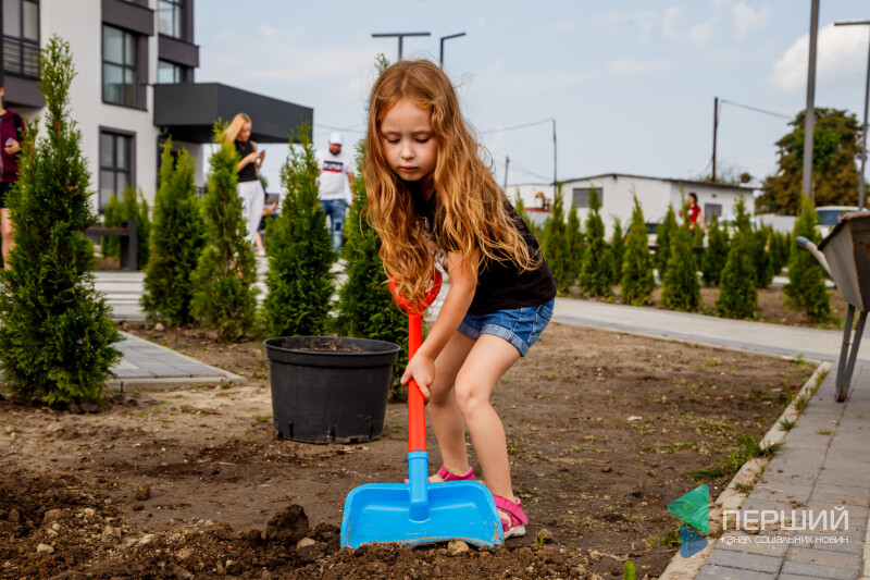 Напередодні на території житлового комплексу висадили понад 200 кущів туї Смарагд, а під час акції садили сакуру, кулясту акацію та клени.