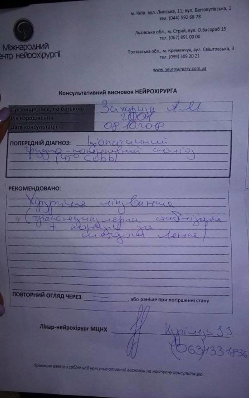 Під час звичайного профогляду в квітні цього року в сільській амбулаторії фельдшер помітив, що хребет дівчинки надзвичайно швидко викривився. За кілька місяців дівчині діагностували сколіоз IV ступеня.