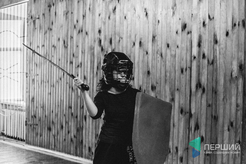 Не встигла я це добре опанувати, як рухи потрібно відпрацьовувати вже в парі. Один нападає, інший – відхиляється. Махати мечем, хоч і м’яким, перед живою людиною страшно. Але ж інакше лицарем не стати – доводиться забувати про жалість до партнера. Через мої хаотичні рухи, кілька разів йому таки дістається. Але роллю нападника доводиться поступатись – моя черга ухилятись. Піймавши ритм, раз за разом присідаю, уникаючи зіткнення з мечем.