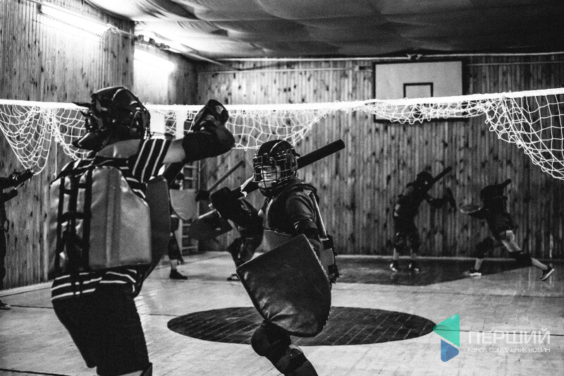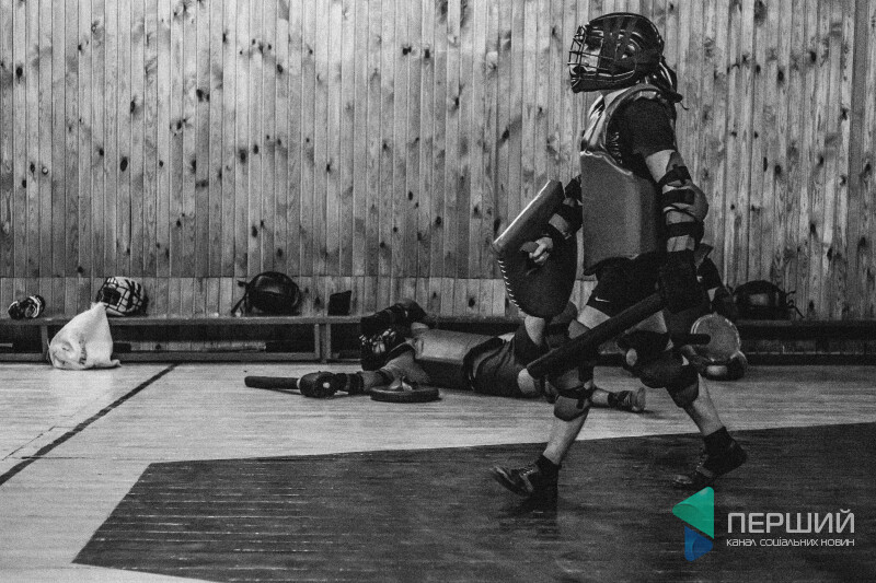 На черзі – розминка у колі. Ну дуже вже вона нагадує вправи зі шкільних уроків фізкультури: повороти головою, плечима, корпусом, крутіння рук в різні сторони одночасно. Кажуть, багато хлопців не можуть це осилити перші кілька тренувань. А добра координація рухів – основа основ у лицарському спорті. У мене виходить – нехитру техніку цієї вправи пам’ятаю зі школи.