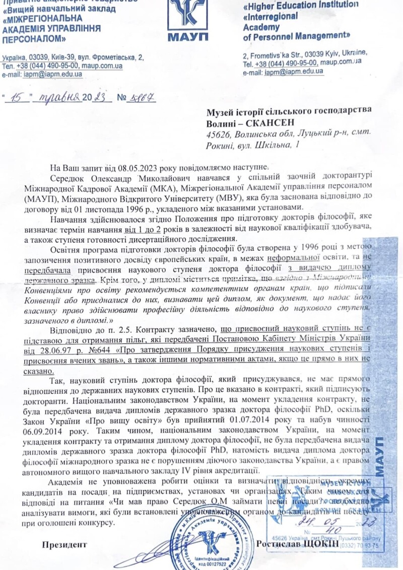 У листі чітко пише: науковий ступінь доктора філософії, який у МАУП присудили Олександру Середюку, «не має прямого відношення до державних наукових ступенів – і про це сказано у контракті, який підписують докторанти». Проте, разом із тим, видача диплому не є порушенням закону (на відміну від доплат до ставки). Так робити цей заклад IV рівня акредитації має право.
