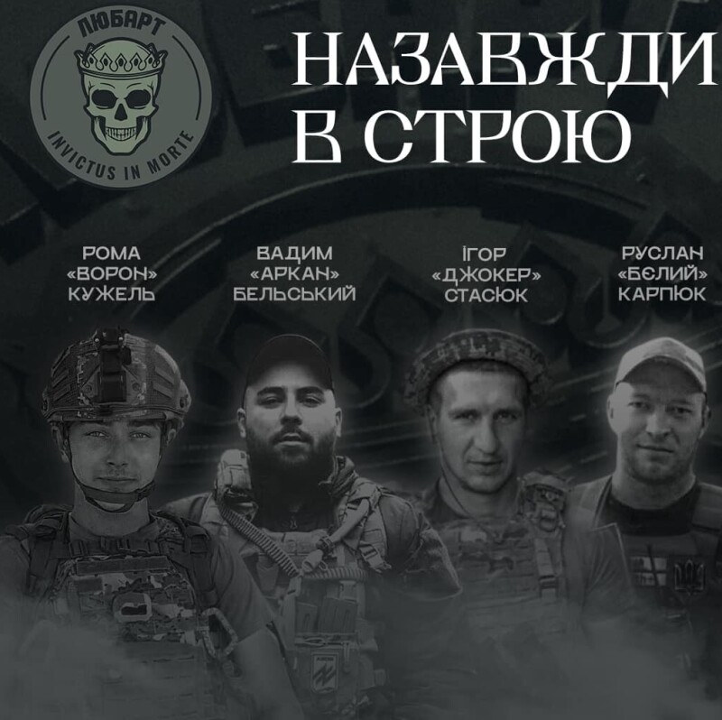 У ході операції зі звільнення української землі на одній з важких ділянок фронту героїчно загинули четвере бійців ОЗСП «Любарт»: Роман «Ворон» Кужель, Вадим «Аркан» Бельський, Ігор «Джокер» Стасюк,