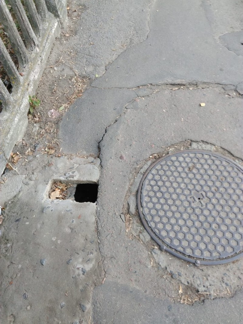 «Вже тиждень ходжу на роботу і спостерігаю таку картину.На мосту (підході до нього)по вул.Незалежності зі сторони Соцбезу біля каналізаційного люка утворилася глибока яма.Чому служби,які обслуговують дану споруду,на це не звертають увагу? Небезпека для пішоходів отримати травму», – йдеться у повідомленні.