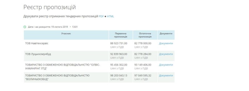 Нагадаємо, замовник планував витратити на будівництво понад 115 мільйонів гривень. Усього в торгах взяли участь 4 компанії ТОВ «Навітехсервіс», ТОВ «Луцьккомунбуд», ТзОВ «ОЛВІС-ІНЖИНІРІНГ ЛТД» та ТзОВ «ТОВАРИСТВО З ОБМЕЖЕНОЮ ВІДПОВІДАЛЬНІСТЮ «ВОЛИНЬЕКОБУД», всівони запропонували нижчу ціну. Найвигіднішою була пропозиція від ТОВ «Навітехсервіс» - компанія погодилася виконати роботи за 82, 778 млн грн.
