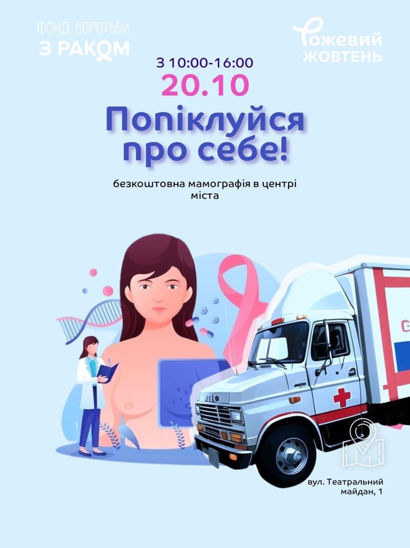 Спеціалізований автомобіль онкоцентру буде розміщений на Театральному майдані з 10:00 до 16:00. Прийом відбуватиметься в форматі живої черги.