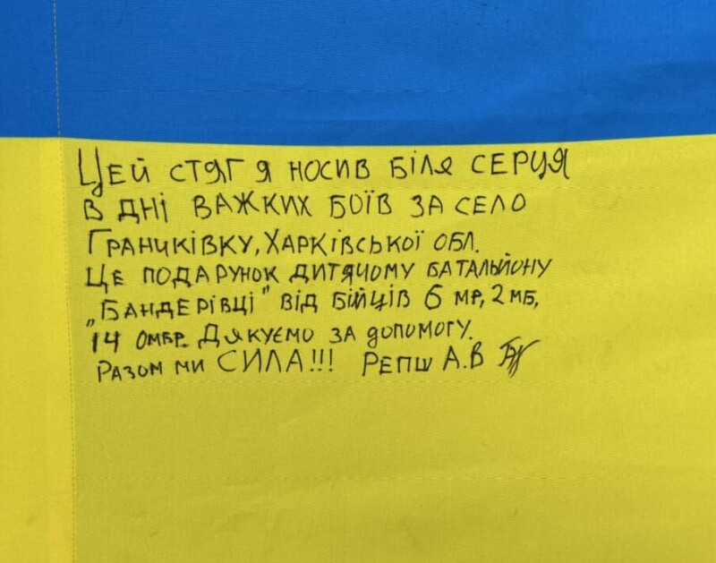 Під час вуличних виступів дітям передали подяку від військових 14-ї бригади імені князя Романа Великого. Український стяг з автографами захисників вручив військовослужбовець Анатолій Репш.