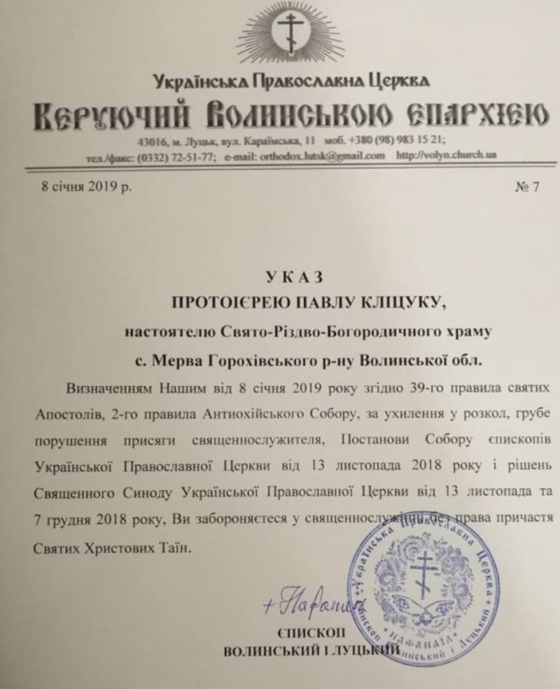В указі йдеться, зокрема, про те, що настоятелю Свято-Різдво-Богородичного храму села Мерва Горохівського району Павло Кліцук забороняється у священнослужінні без права причастя Святих Христових Таїн через через «ухилення в розкол та грубе порушення присяги священнослужителя».