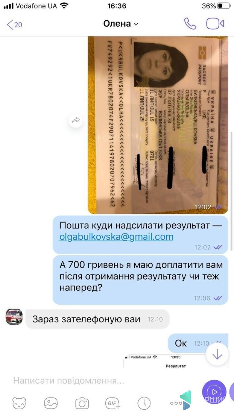 За кілька годин після оплати завдатку «Олена» зателефонувала і сказала, що результат можна забрати вже сьогодні, але наголосила, що іншу частину суми потрібно надіслати на картку. «Якщо не надішлете, це буде на вашій совісті, і ми тест просто анулюємо», – додала вона.
