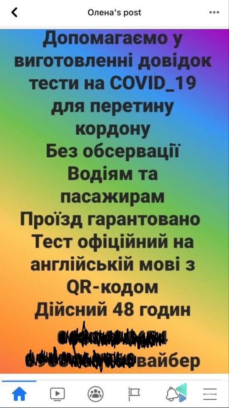Кілька днів тому редакція «Першого» побачила в місцевій спільноті «Мій Камінь-Каширський» у Фейсбуці дивний допис: «Робимо тести на коронавірус для перетину кордону. Без обсервації. Водіям та пасажирам. Проїзд гарантовано. Тест офіційний англійською мовою з QR-кодом».