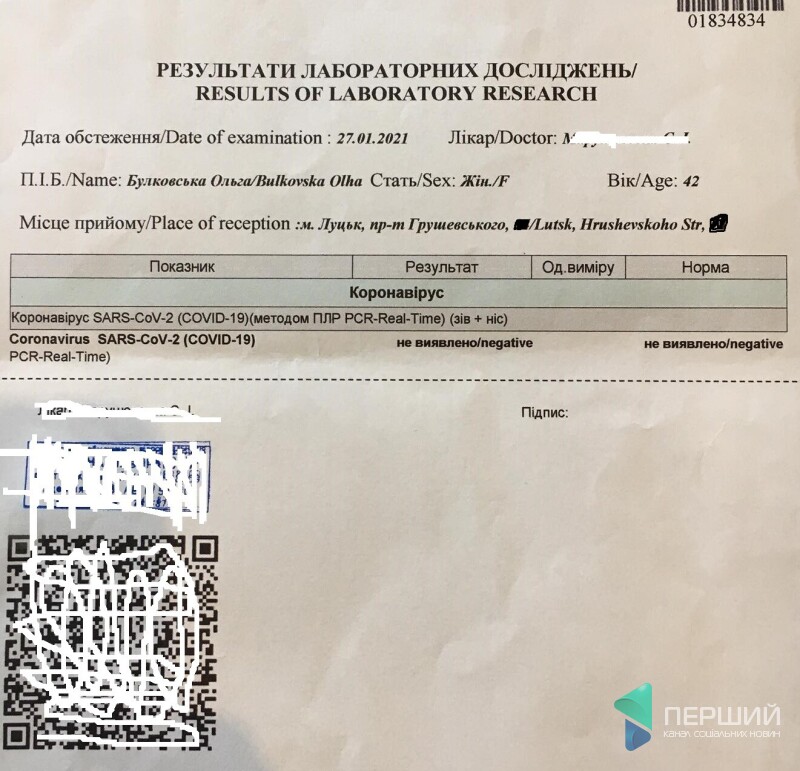 Два дні перемовин, 300 гривень завдатку (залишок суми ми, звісно ж, не доплатили – хай вже вибачають ковід-бізнесмени) і ось результат – негативний результат ПЛР-тесту у нас в руках. Документ з печаткою, штрих- та QR-кодом, перекладом англійською. При тому, що аналіз наша редакторка не здавала.