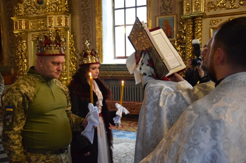 Настоятель храму отець Микола і військовий капелан протоієрей Михайло Хімчак благословили подружжя, побажали їм любові, вірності та Божого захисту. Символом їхньої єдності став рушник, на який вони разом стали, вплітаючи у нього свої мрії та надії на щасливе майбутнє.