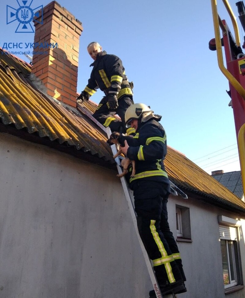 8 листопада о 09:25 вогнеборці 10 державна пожежно-рятувальна частина міста Любомль Ковельське районне управління ГУ ДСНС України у Волинській області по драбині дістались до чотирилапого «верхолаза» та зняли його на руках з покрівлі на землю.