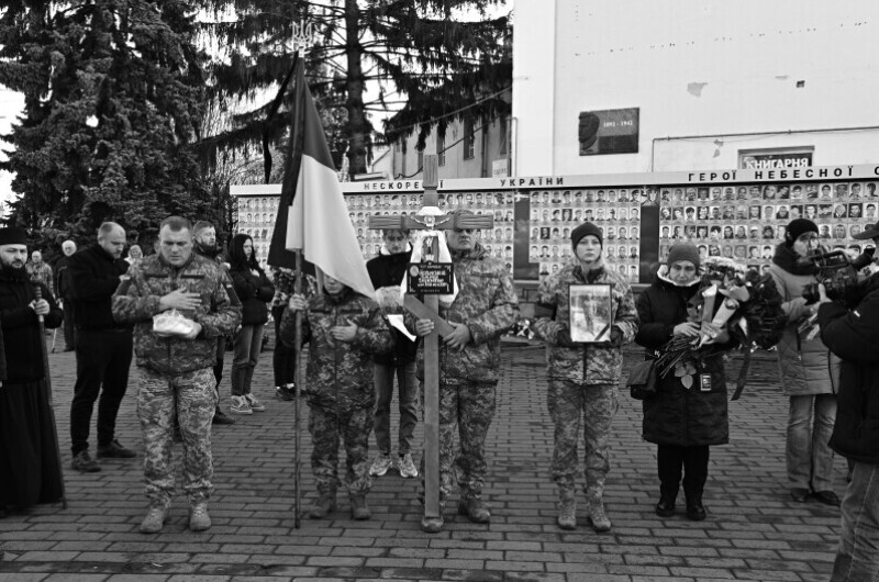 Після завершення богослужіння труну з тілом покійного захисника пронесли Театральним майданом. Біля пам’ятного фотостенда загиблим Героям присутні зупинилися і виконали Державний Гімн України.