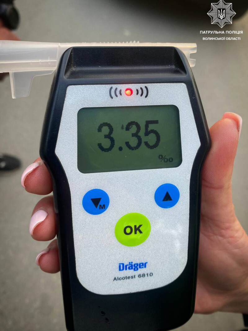 Під час спілкування з керманичем стало зрозуміло, що він перебуває у стані алкогольного сп’яніння. Це підтвердив і прилад Drager, за допомогою якого громадянин погодився пройти огляд на місці події. Алкотестер показав результат 3,35 проміле.
