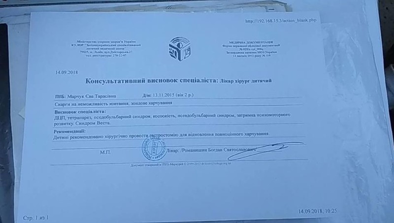 Під час операції дитині встановлять гастростому – спеціальну трубку, через яку вводитимуть їжу просто в шлунок. Таким чином дитина харчуватиметься все життя.