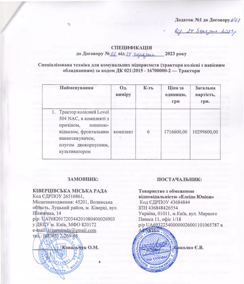 Прямий договір зі столичним підприємством «Елсідо Юніон» про закупівлю техніки Ківерцівська міськрада уклала 24 березня цього року після того, як на першу процедуру відкритих торгів не з’явилося жодного учасника. За умовами угоди разом із шістьма тракторами підприємство мало поставити громаді навісне обладнання, а саме: причепи, лопати-відвали, фронтальні навантажувачі, плуги двокорпусні та культиватори.