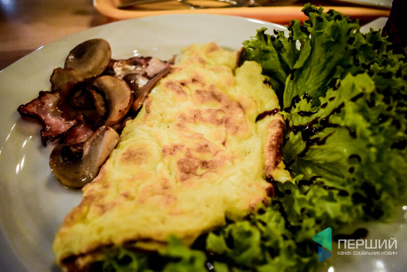 Омлет із сиром. Всередині омлету – щедрий кавалок розплавленого сиру і помідори. Окремо до омлету подали печериці та кілька шматків смаженого бекону. Смачно. Трохи не підійшов смак бальзамічного оцту, яким скропили листя салату, але це – на любителя.