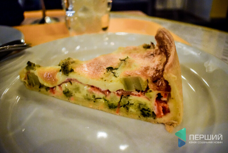 Пиріг з броколі та помідорами черрі. Багато начинки, вона дуже ніжна – в вершковому соусі, тісто м’яке і «пишне» (хоча як на мене – сюди б краще пасувало пісочне тісто). Хто любить броколі – залишиться задоволеним.