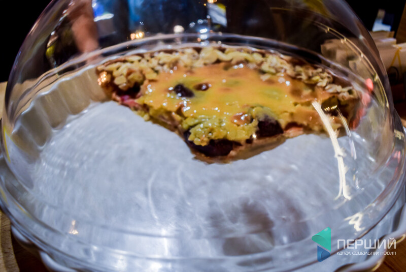 Сливовий пиріг. Надзвичайно тонкий шар тіста і просто величезна кількість соковитої начинки зі слив. В міру солодкий, не нудний смак – можна сміливо брати величезний шматок, а не оту «рісочку», яку вирішили взяти на пробу ми.