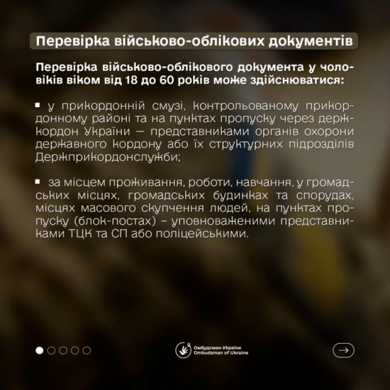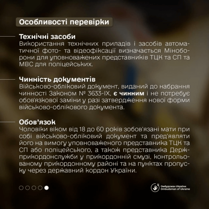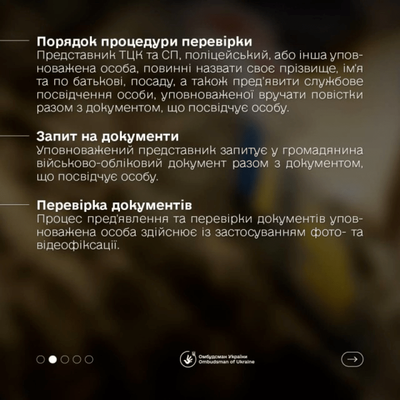Крім того, особа, яка здійснює перевірку військово-облікових документів, зобов’язана назвати своє прізвище, ім’я та по батькові, посаду, а також показати службове посвідчення особи, уповноваженої вручати повістки разом із документом, що посвідчує особу.