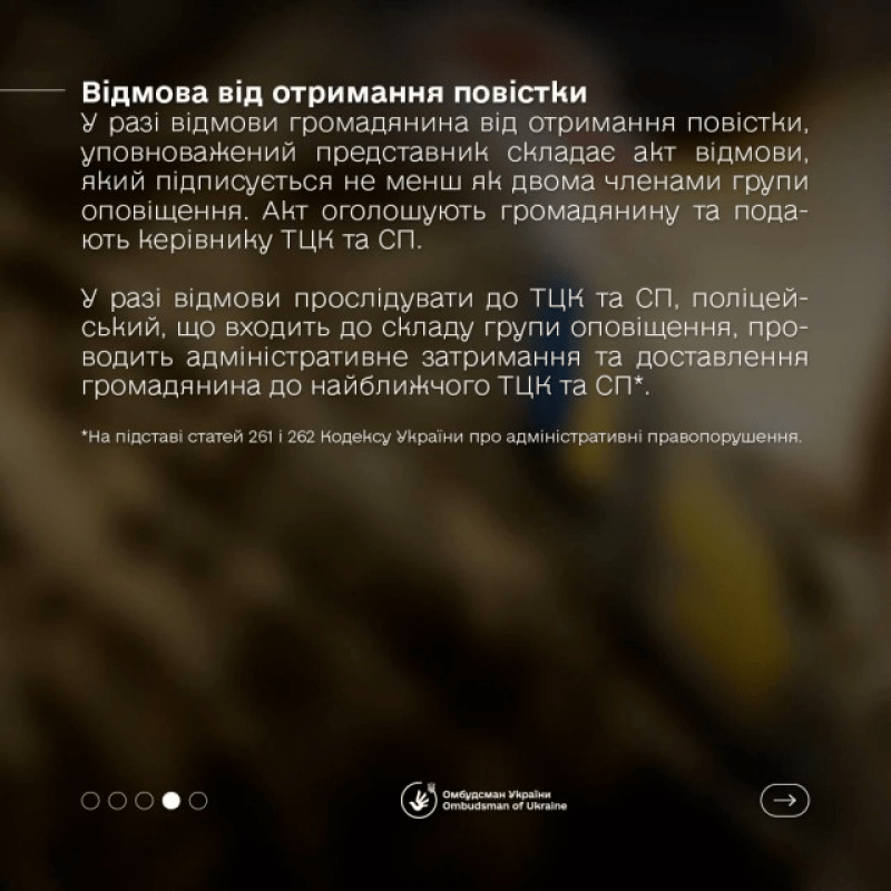 У разі відмови прослідувати до ТЦК та СП поліцейський, який входить до складу групи оповіщення, проводить адміністративне затримання та доставлення громадянина до найближчого ТЦК та СП.