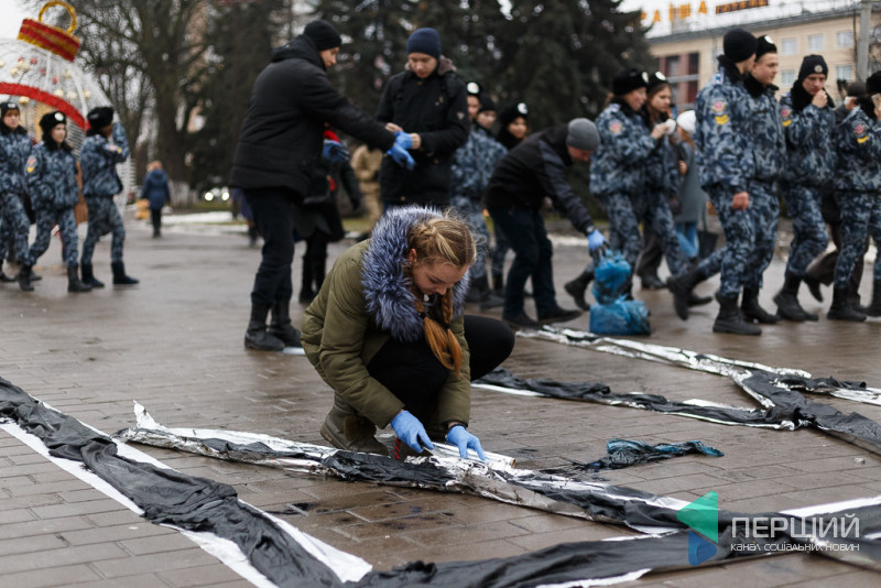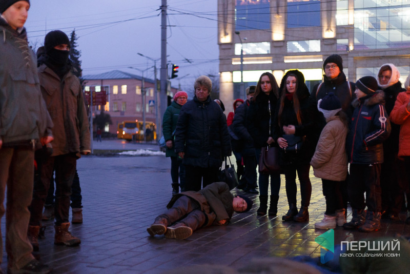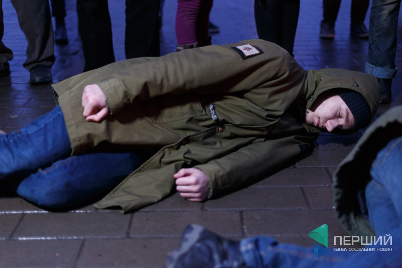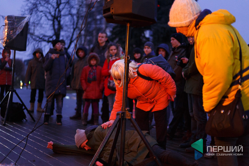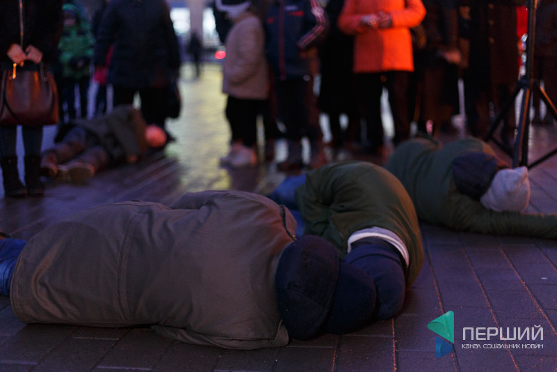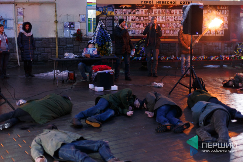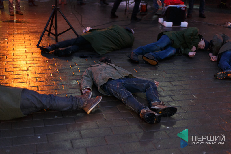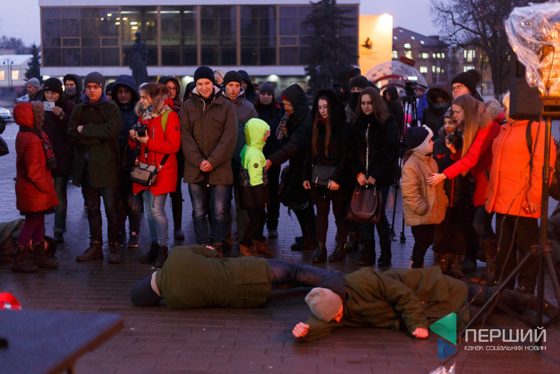 Організатори заходу провели флешмоб: під час зачитування імен полеглих молодих українських воїнів, падав на землю один учасник – це символізувало смерть крутівця від кулі.