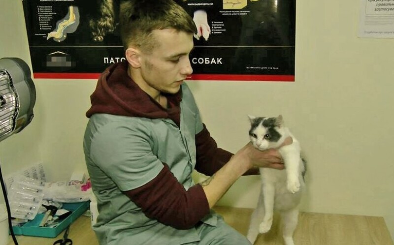 Під час морозів у своїй ветклініці ветеринар прихистив бездомного кота. Каже: тварина була хвора, і за кілька днів більш-менш одужала. "Він тут три дні пожив, більш-менш оклигав. Його випустили назад, він оклигав. Другий раз його прихистили, ну, відповідно, він вже залишився", – каже чоловік.