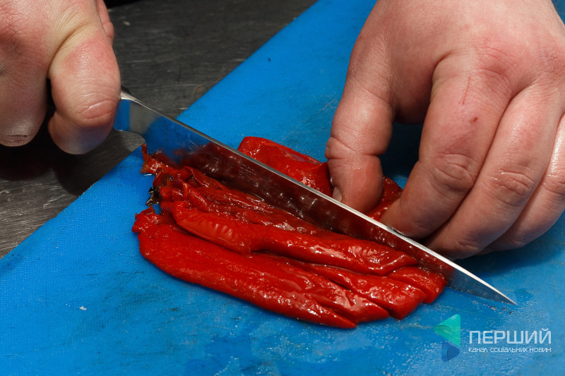 Перець спекти на грилі, зняти шкірку та порізати довгими тонкими смужками. Додати до порізаних овочів.