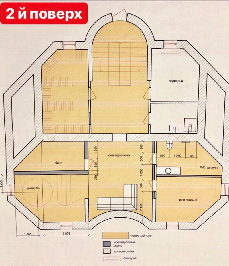 Проект передбачає сауну, баню, ванну кімнату та кімнату відпочинку на цокольному поверсі. У будинку є 5 спалень та велика простора вітальня з каміном. Є тераси для відпочинку, як на першому, так і на другому поверхах.