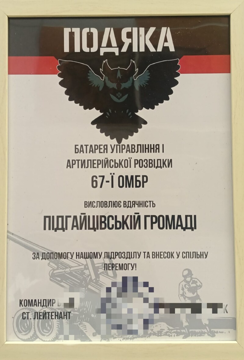За допомогу підрозділу та внесок у спільну Перемогу командир 67 ОМБР відзначив Підгайцівську громаду подякою.