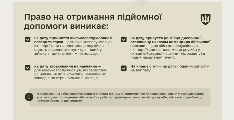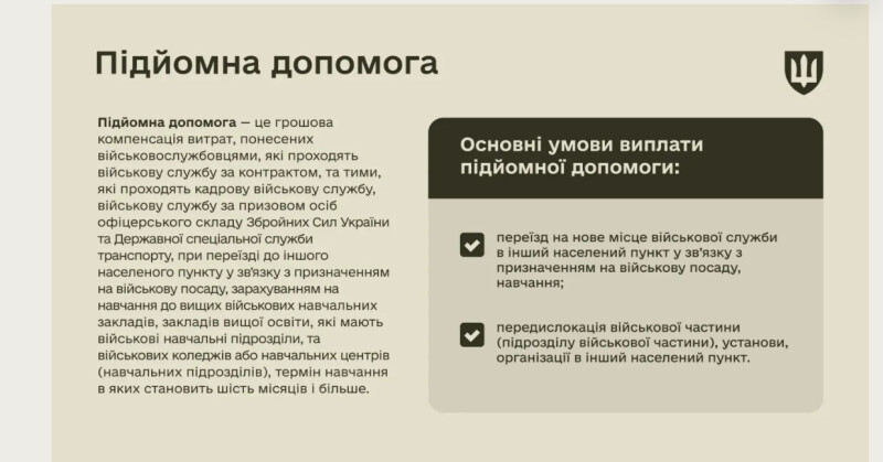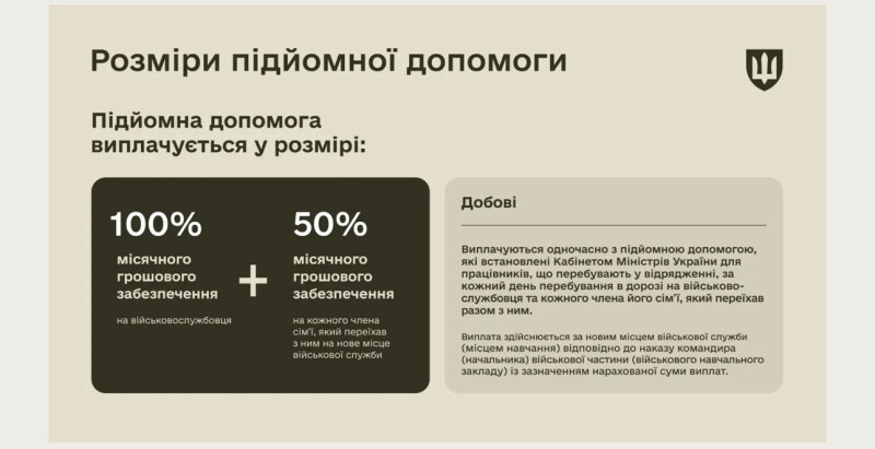 Вона виплачується при переїзді до іншого населеного пункту у звʼязку з призначенням на військову посаду, зарахуванням на навчання до вищих військових навчальних закладів, закладів вищої освіти, які мають військові навчальні підрозділи, та військових коледжів або навчальних центрів (навчальних підрозділів), термін навчання в яких становить шість місяців і більше, інформує Міноборони.