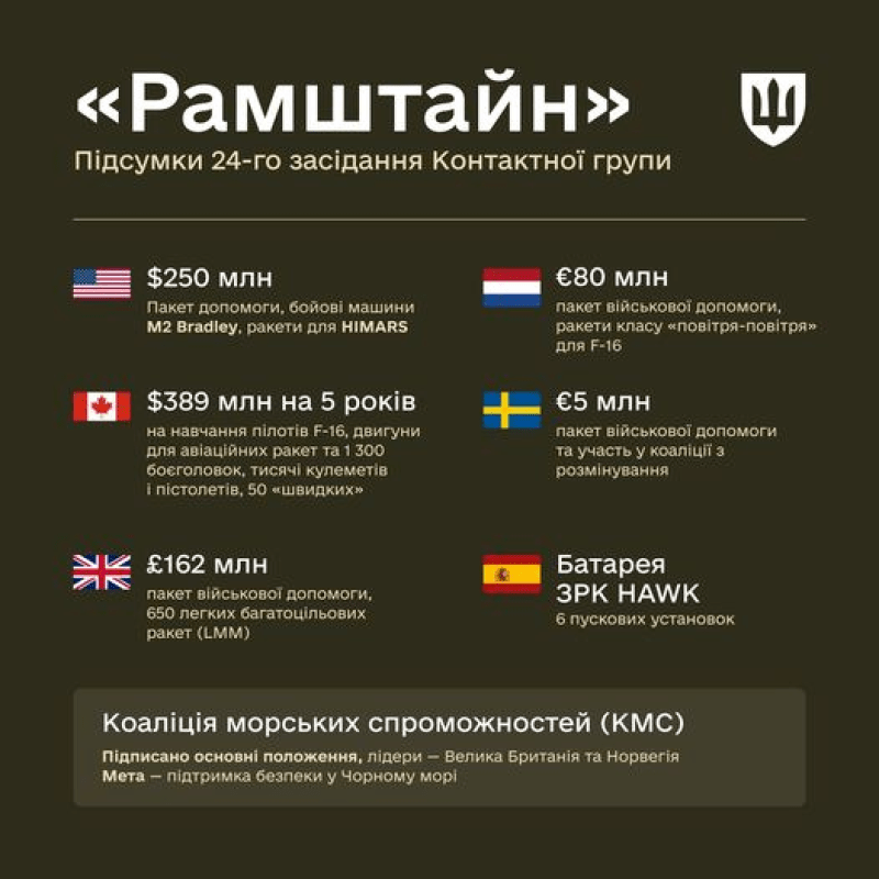 Ще один ключовий результат зустрічі з союзниками — підписання Положення Коаліції морських спроможностей (КМС). Цього року Україна робить особливий акцент на «морській обороні», – написали в Міноборони.